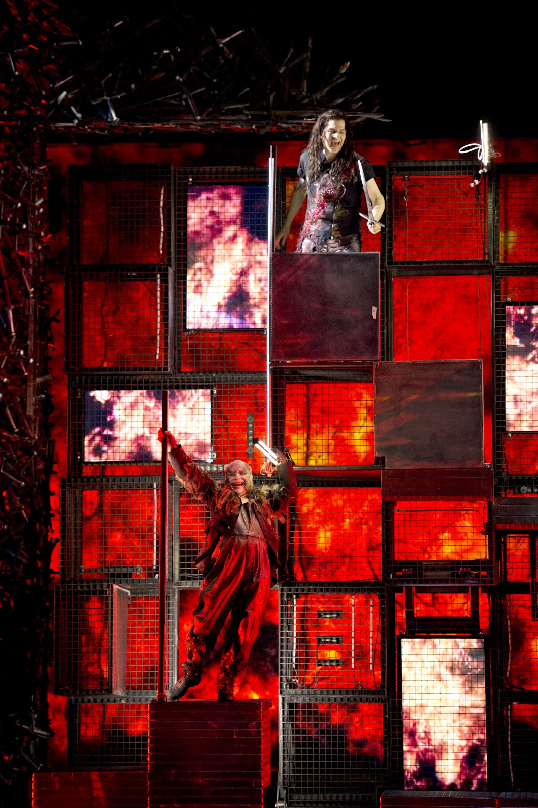 El muntatge no va facilitar les coses a Uusitalo. Durant les preguntes amb Mime, la plataforma sobre la que s’estava es va anar aixecant fins a arribar a una posició vertical, amb Uusitalo fent equilibris i, després, baixant amb molta cura per no obrir-se el cap. Un altre exemple de sabotatge als cantants: la roca de Brünnhilde és un monticle cobert de roba del qual la valquíria ha de pujar i baixar amb un vestit amb una cua quilomètrica. Si el que transmet la posada en escena és patiment per la integritat física dels cantants és que alguna cosa no funciona, per molt que es vulgui dissimular amb pomposos discursos dramatúrgics al programa de mà.